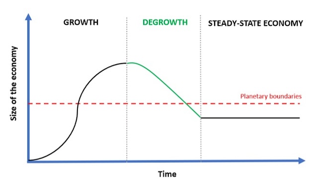 Penting untuk memahami bahwa degrowth bukan tentang penurunan ekonomi yang terus-menerus, melainkan tentang mencapai keseimbangan antara aktivitas ekonomi dan kesehatan planet (Gambar 2). Maka, pendukung degrowth harus terus menjelaskan bahwa degrowth bukan tentang mengurangi PDB, tetapi tentang mengurangi aliran material dan energi (Hickel 2021).