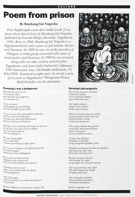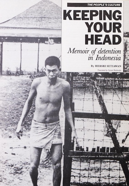 A quick survey of ‘The People’s Culture’ during Inside Indonesia’s first few years produces a roll-call of prominent names among the community of ex-tapols and their younger generation counterparts. The first three issues of the magazine featured translations of poems by Putu Oka Sukanta, a former member of the PKI’s cultural organisation who was released in 1976 after ten years’ political imprisonment. There were poems by Rendra, one of the regime’s most prominent critical voices in the arts. Also included was a reflection by ex-tapol Hersri Setiawan, published under the title ‘Keeping Your Head, An Indonesian Political Prisoner Remembers’ (October 1984).