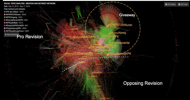 In response to these protests, pro-government forces financed online public opinion manipulation in order to gain acceptance for the controversial legislation. To increase public support for the revision of the KPK Law, cyber mercenaries were mobilised to steer online discussions on the topic towards a pro-revision narrative, by bombing social media, especially Twitter, with pro-revision messages, memes and hashtags.