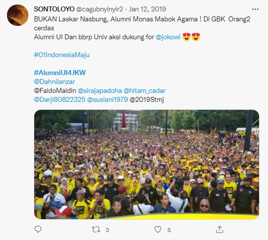 For example, when Jokowi visited Padang on the campaign trail, the narrative that dominated on Twitter was the uniqueness and beauty of the region and its people. Another frequently chosen topic was the support of prominent people for Jokowi. One occasion that was magnified on social media was when the alumni association of the University of Indonesia (UI Alumni) expressed their support for Jokowi during one of Jokowi’s rallies at the Bung Karno Stadium in Jakarta, in January 2019. Promptly, Twitter was flooded with the hashtags #AlumniUIDukungJokowi (‘UI Alumni Support Jokowi’) and #AlumniUI4JKW (‘UI Alumni for Jokowi’).