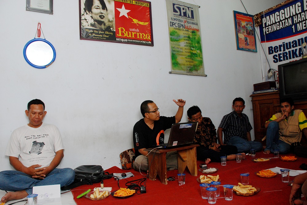 The meetings discussed topics beyond labour rights - in this meeting, NGO activists and union members discuss government budget monitoring in Pekalongan. (Hari Nugroho) |