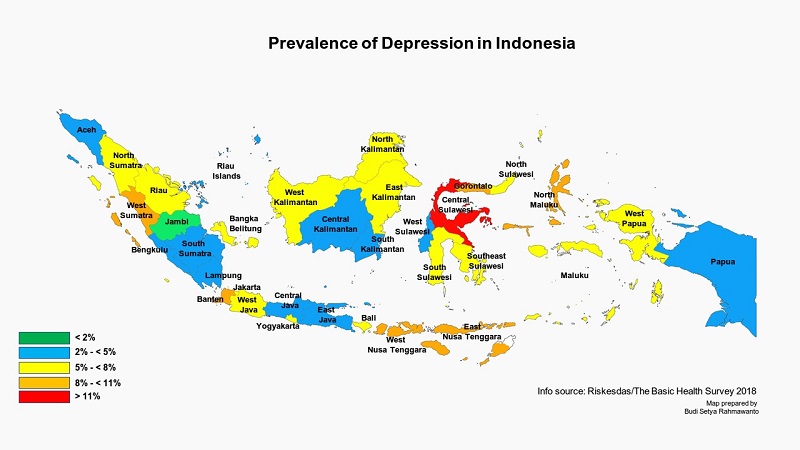Perhitungan prevalensi depresi terbaru dan paling dapat dipercaya datang dari Riskesdas (Riset Kesehatan Dasar) yang dipublikasikan pada tahun 2018. Hasilnya menunjukkan bahwa 6.1 persen dari sampel yang mewakilkan populasi atau lebih dari 163,000 orang Indonesia menderita depresi, dengan 9.8 persen dari sampel tersebut menderita gangguan emosional umum (angka ini mencakup orang yang menderita depresi, kecemasan, dan gangguan lainnya yang terkait). Terlepas dari bagaimana calon pasien menyampaikan keluhan kepada tenaga kesehatan, prevalensi gejala depresi pada orang Indonesia sama dengan rata-rata global.