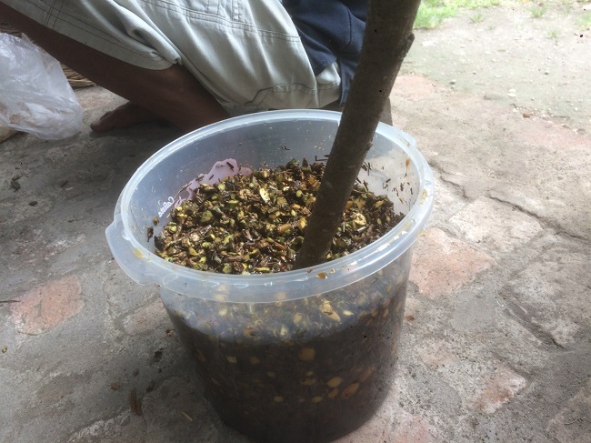 For example, in our class we learned how to make nutrisi hayati (natural nutrition) by extracting essential macronutrients required by plants, such as nitrogen, phosphorus, potassium and calcium, using locally available ingredients. This input has similar functions to organic fertiliser. The ingredients we commonly use are cow bones, brotowali (Tinospora crispa), catfish and roasted eggshells. These are fermented with palm sugar before being applied to plants. In the preparation of nutrisi hayati, fermentation by microorganisms is very important. If the mentioned materials are not available they can be replaced with other ingredients as long as they contain the same four macronutrients. This helps to make the natural farming method more adaptable and lower in cost than conventional agriculture.