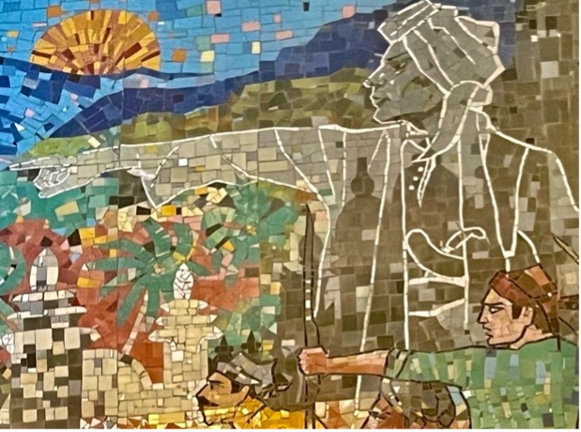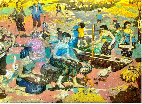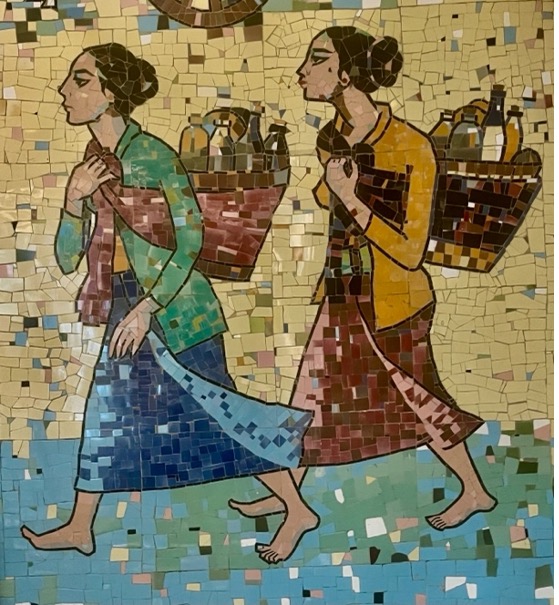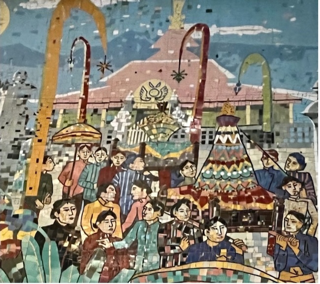 The mosaic is a romanticised portrait of rural Java. Aside from a small image of the 9th century Buddhist monument Borobudur, there are no identifiable places. The images are of healthy and happy young people, most of them women, engaged in the daily activities of village life, farming, preparing food, bullock carts and a village market. A scene of young women bathing in a river may reflect Sukarno’s interest in erotic imagery. The overall simplicity and lack of symbols of conflict and modernity evokes his Marhenist ideology that locates the essence of Indonesia in self-sufficient village communities. It also resonates with the nostalgia many Javanese have for the (alleged) simplicity and tranquility of village life.