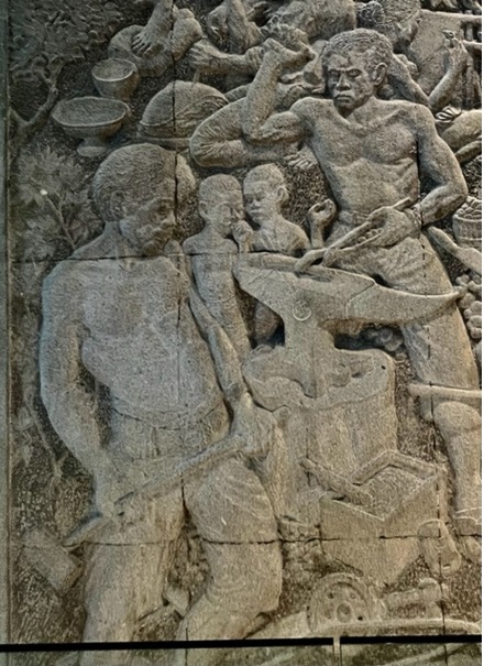 Untung Rugi di Lereng Merapi is stylistically very different from the two mosaics. It is a relief carving similar to those found on the ancient Buddhist and Hindu monuments Borobudur and Prambanan. It also includes elements of socialist realism, the Soviet art style that combined realist technique and idealist representations of life under socialism, or in Sukarno’s case Marhenism. Merapi is the volcano located to the north of Yogyakarta. Villagers living on its slopes are threatened by periodic eruptions the most recent of which was in 2010. Until the 1980s with the proliferation of cars and motorcycles and the resulting air pollution it was clearly visible nearly every day from any place in the city. It also figures prominently in the sacred geography of the Yogyakarta Sultanate. Sunan Merapi is the guardian of the mountain and is believed to prevent lava and pyroclastic flows from reaching the city. It is also the northern terminus of a mystical axis that extends through the kraton and ends at a shrine dedicated to Gusti Kangjeng Ratu Kidul, the Queen of the spirits of the Southern Ocean and spirit wife of the Sultans of Yogyakarta at Parangkusumo on the southern coast.