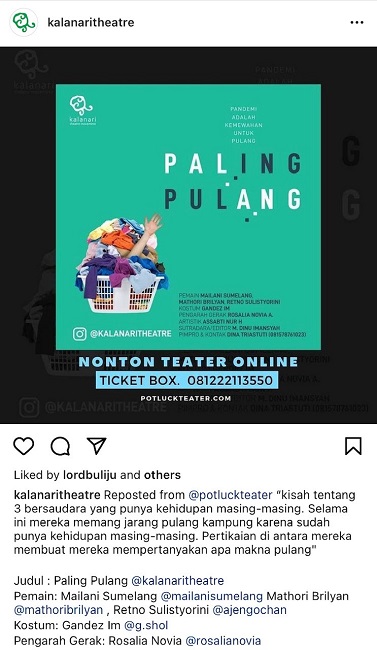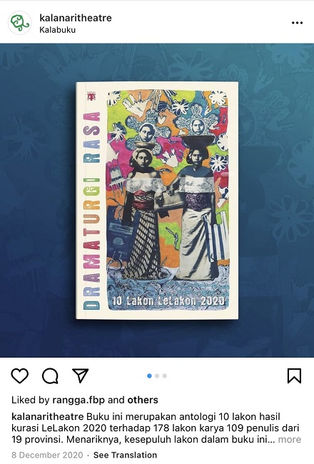 The highlight of my work during the pandemic has been LeLakon, a platform for curating Indonesian plays with the aim of collecting, documenting and disseminating plays by Indonesian theatre artists and writers. The plays were collected through an open call, curated by a team of curators, then published in the form of an anthology. LeLakon 2020 was the work of Kalabuku and Kalanari working together with the Indonesian Dramatic Reading Forum (IDRF), Kala Theatre in Makassar, and the Bandung Performing Arts Forum.